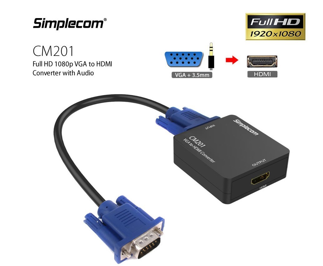 Simplecom CM201 VGA to HDMI Converter allows you to convert analog VGA signals to digital HDMI signals. 1x CM201 VGA to HDMI converter. Support HDMI digital output with resolutions up to 1080p. This converter is NOT bi-directional.