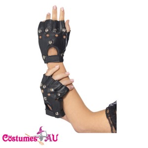 Mens 80s Black Punk Gloves Studded Fingerless Biker Gothic Faux Leather Costume