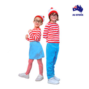 Kids Find Me Wheres Wally Waldo Cosplay Stripe Shirt Hat Party Book Week Stick AU $20.95 to AU $29.95
