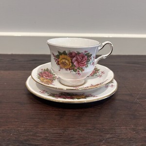 Vintage Queen Anne Tea Cup & Saucers – Rose Floral Design, Gold Trim, England